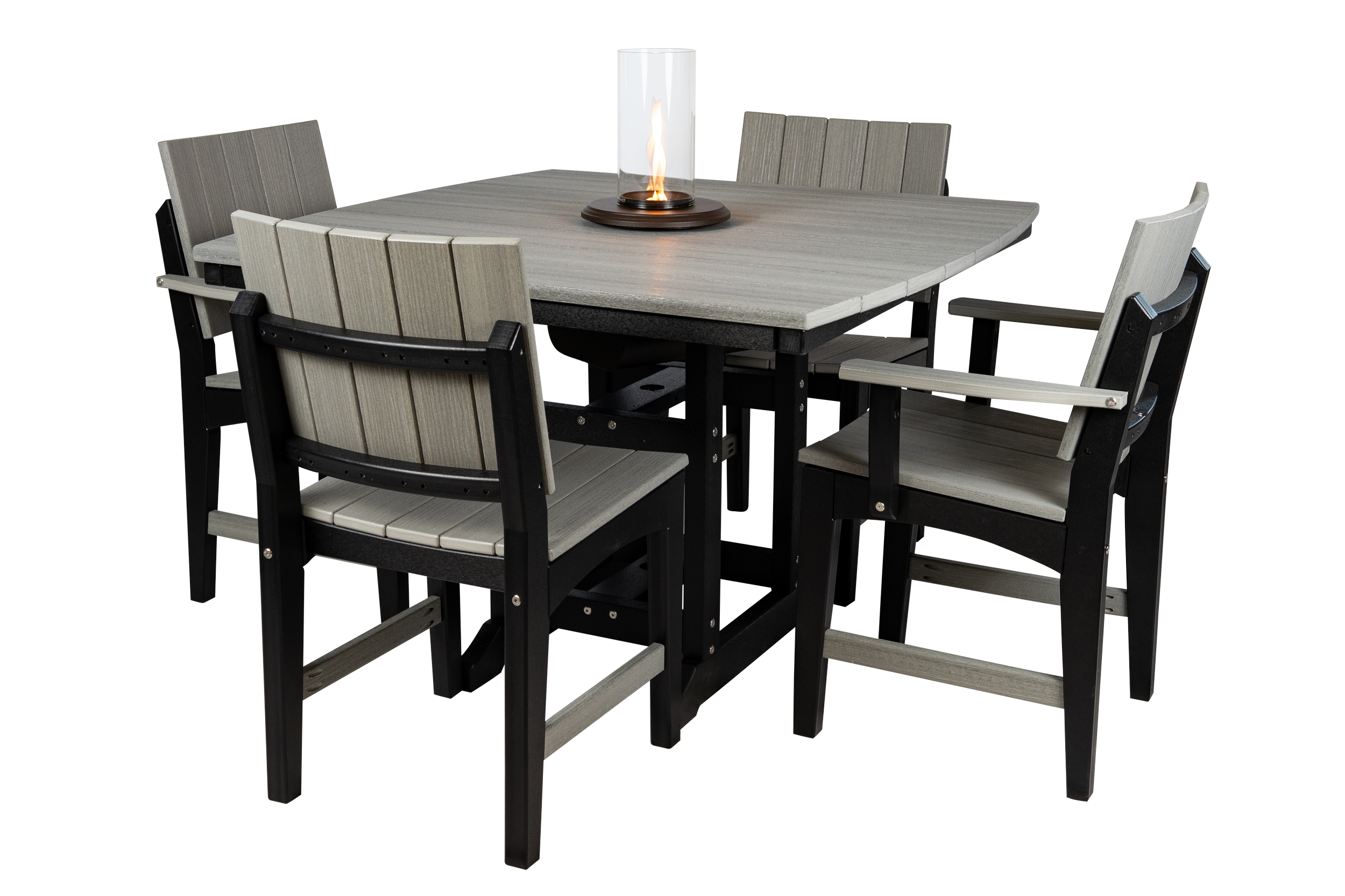 Rogue River Table, R-100, 44” Square with Bow End (Driftwood Grey/Black). 44” Square x 30”H; pictured with Sunriver Dining Chairs (S-130), Sunriver Dining Arm Chairs (S-135), & Intrigue Lantern.